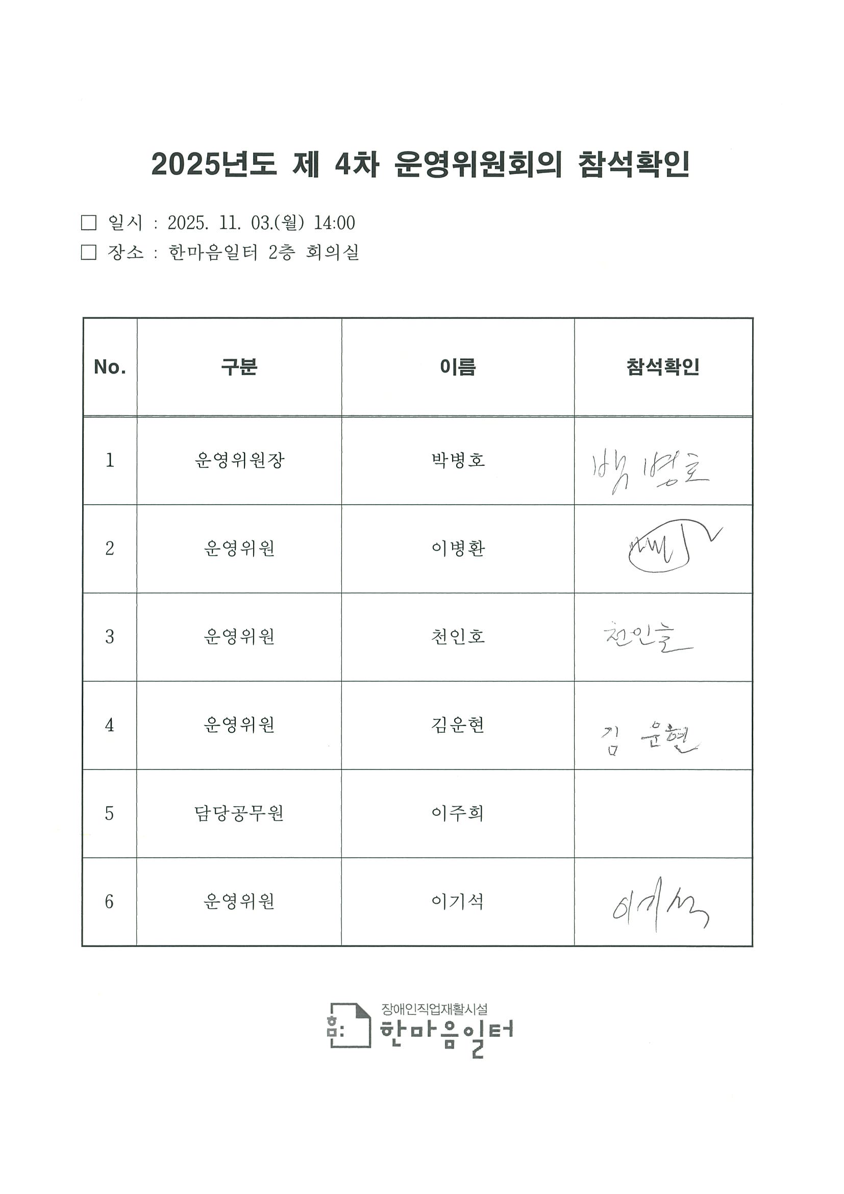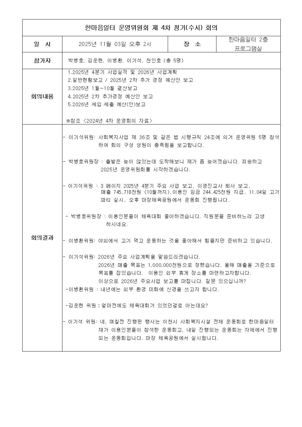 2025³â 11¿ù 03ÀÏ(¿ù) ÇѸ¶À½ÀÏÅÍ 4Â÷ ¿î¿µÀ§¿øÈ¸ÀǸ¦ ÁøÇàÇÏ¿´½À´Ï´Ù. ȸÀǽð£ 14:00~15:00·Î ȸÀÇ °á°ú¸¦ ºÙÀÓ°ú °°ÀÌ °ø°³ÇÕ´Ï´Ù.